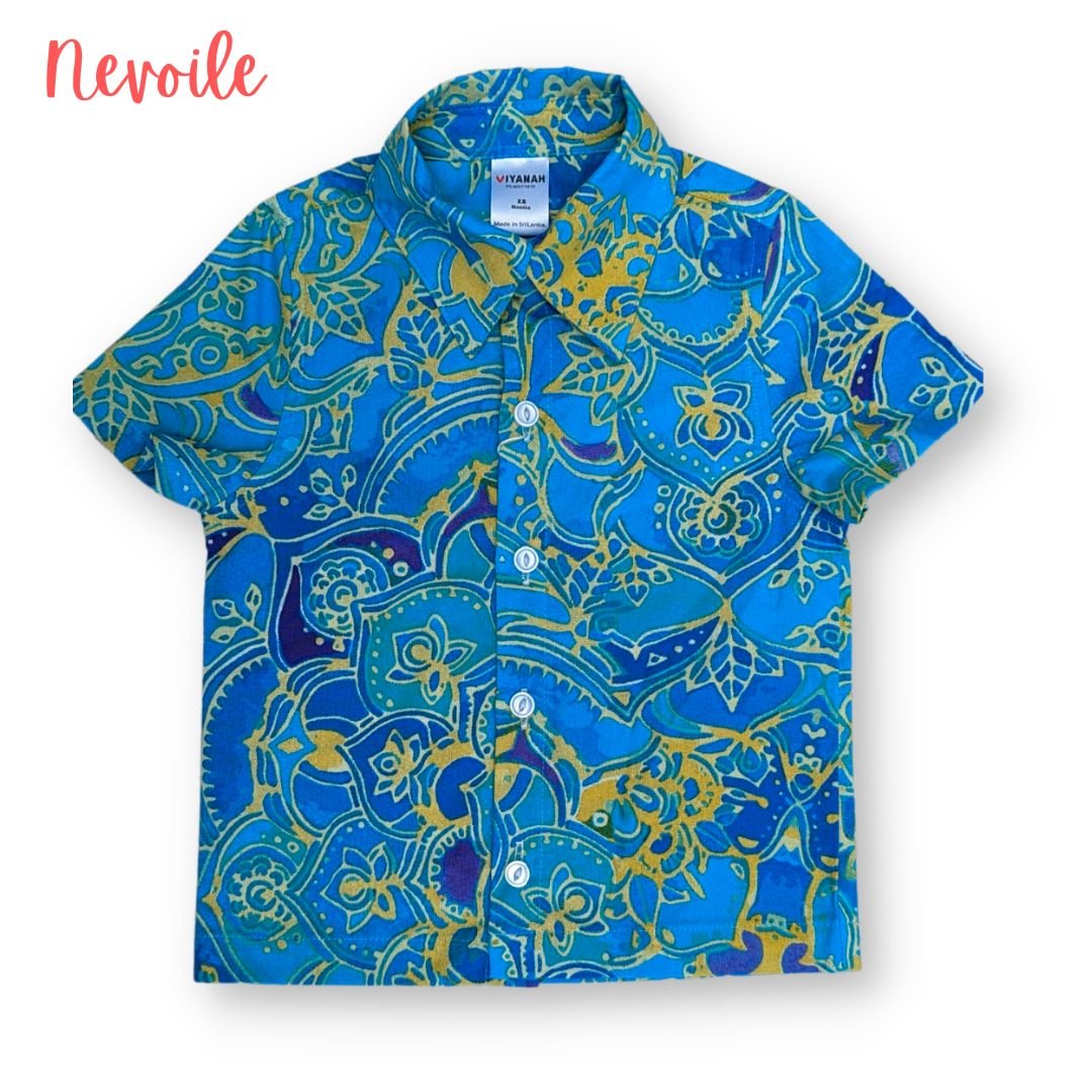 Vibrant blue linen shirt for boys, featuring a cheerful yellow pattern. Lightweight and perfect for casual or festive occasions.